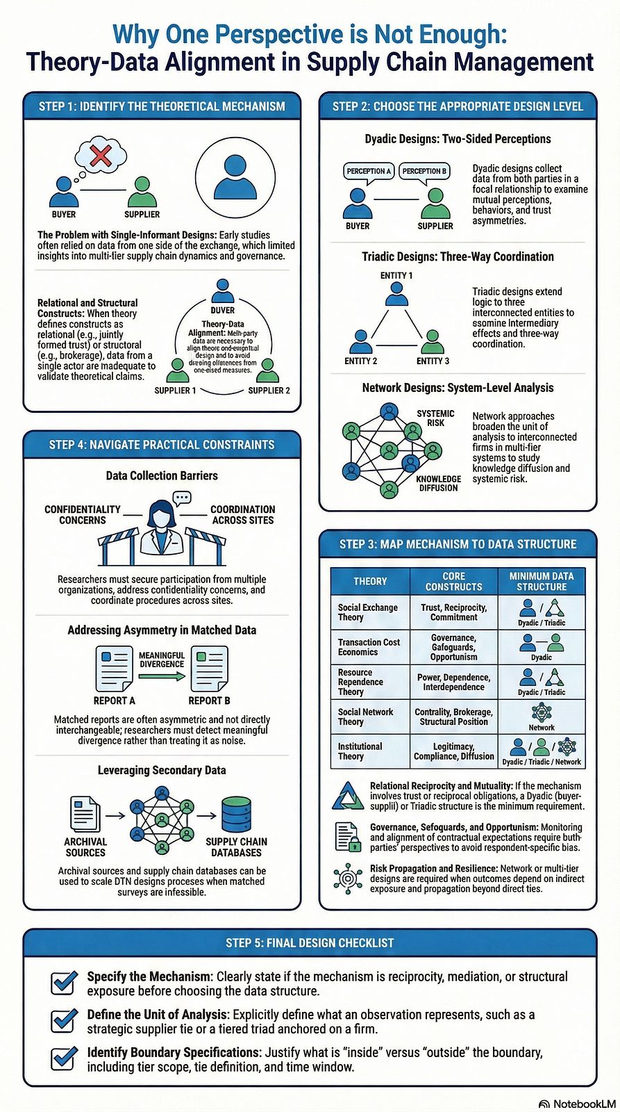 That distinction matters because supply chain phenomena are often asymmetric. Buyers and suppliers may not perceive trust, fairness, or dependence in the same way. A third actor, such as a logistics provider or a lower-tier supplier, can shape outcomes even when it sits outside the focal dyad. Network position can affect risk exposure or innovation even when a firm’s direct partner relationships look stable. When we study these mechanisms with one-sided data, we can miss misalignment, hidden dependencies, and indirect effects.